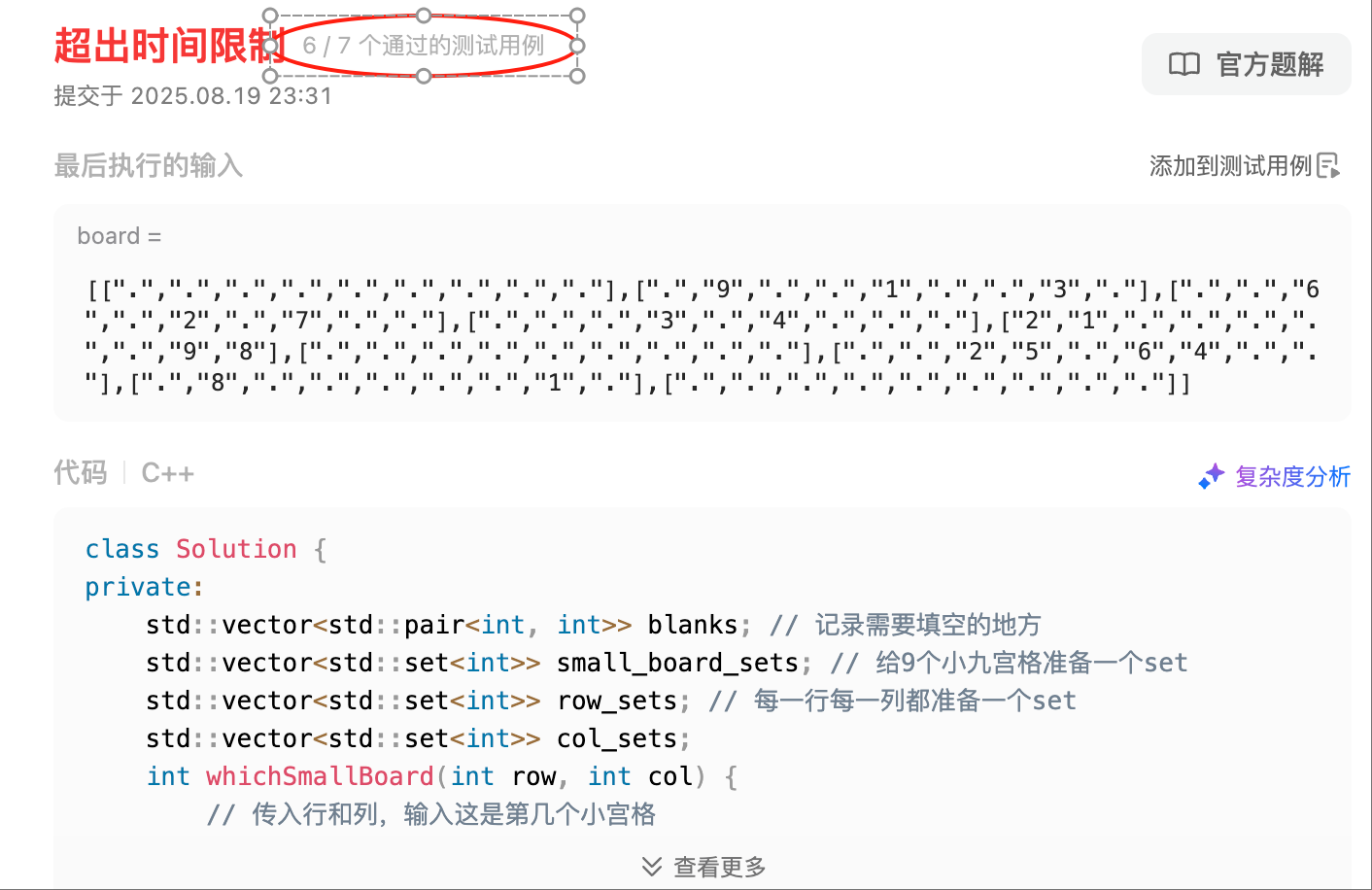 写了一个半小时,一次写对。感觉已经尽力了,还有最后一个测试用例超时了。
