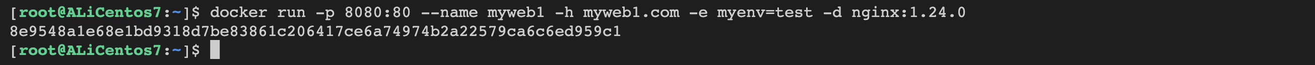 docker run -p 8080:80 --name myweb1 -h myweb1.com -e myenv=test -d nginx:1.24.0