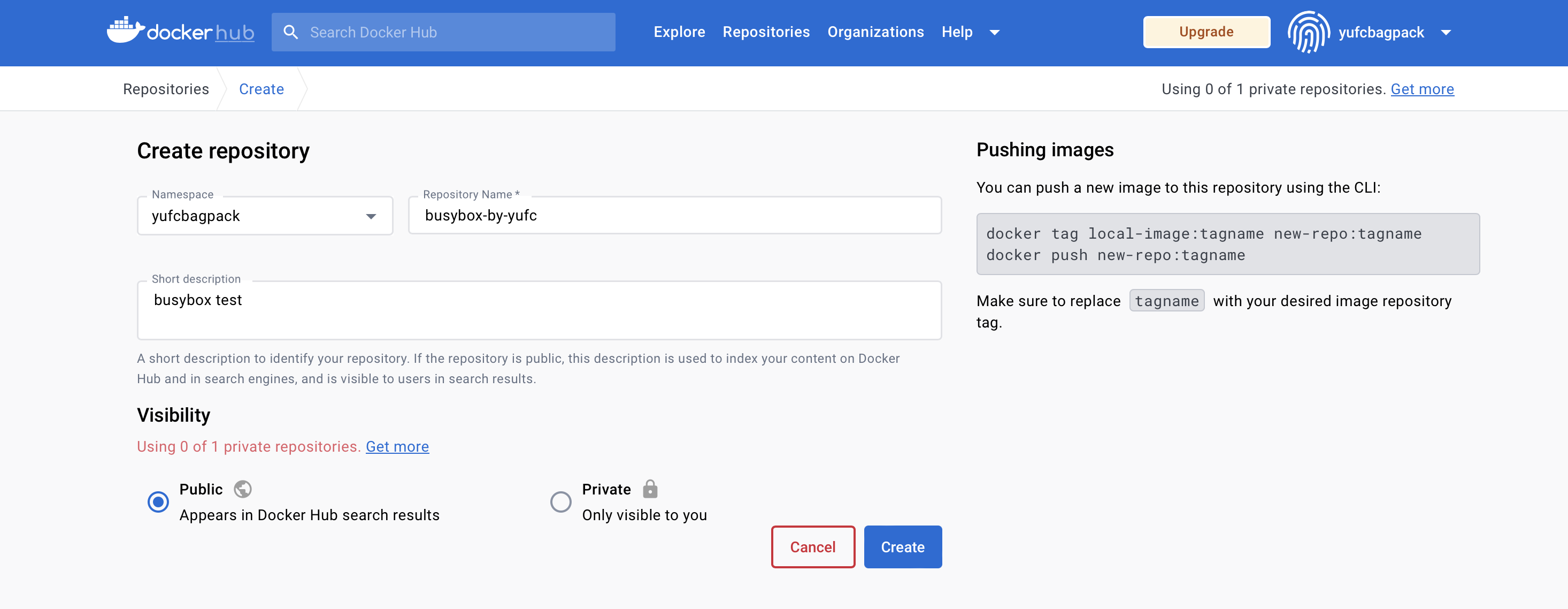 docker tag busybox:1.36.0 yufcbagpack/busybox-by-yufc:v1.0push上去。