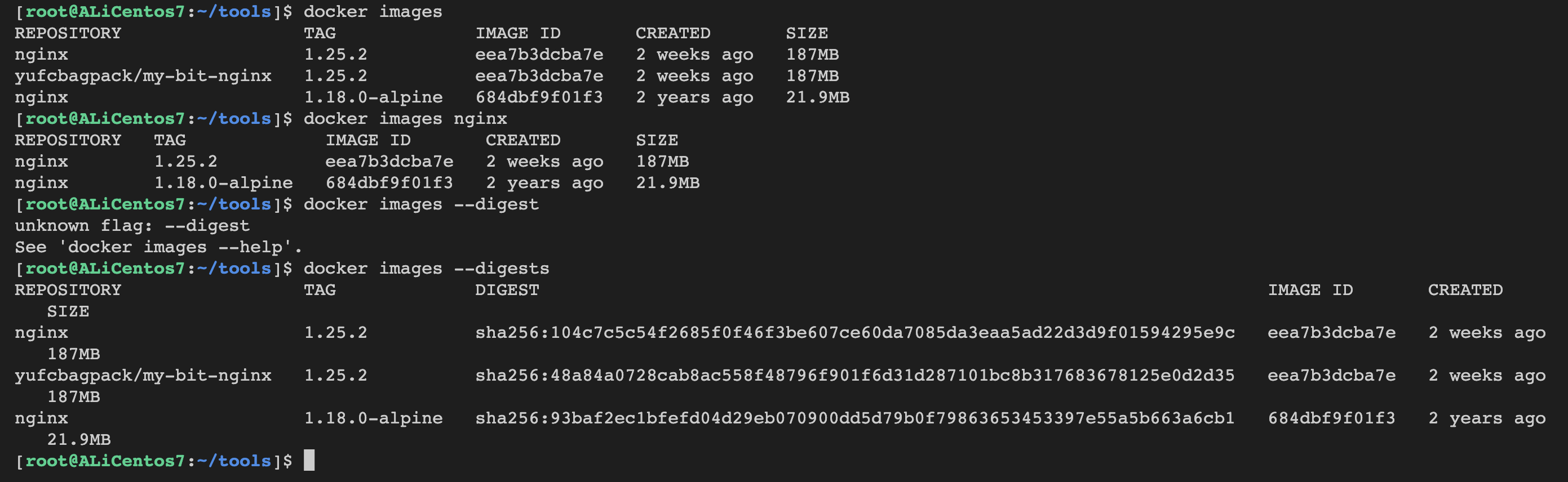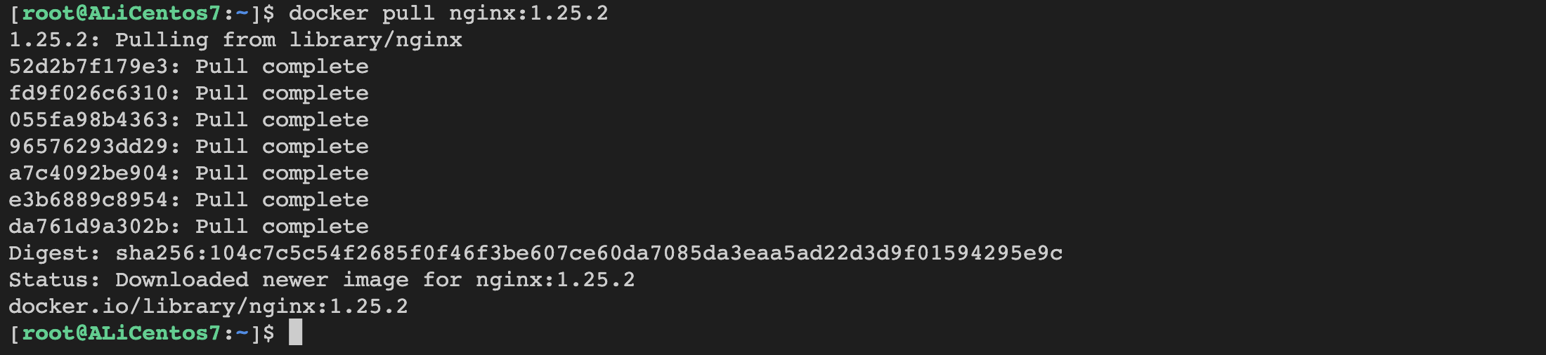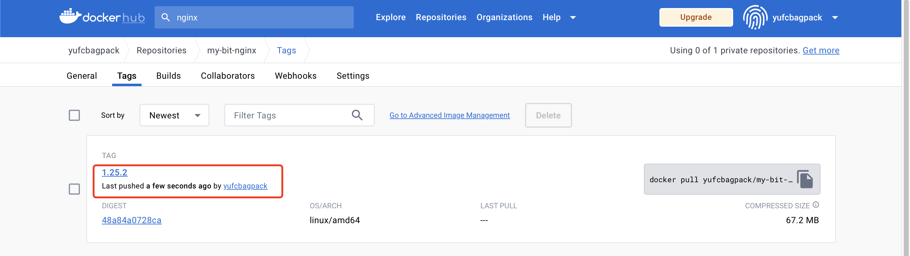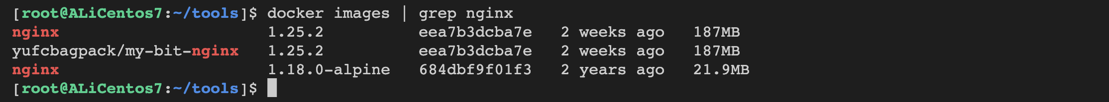 xxxxxxxxxxdocker tag nginx:1.25.2 yufcbagpack/my-bit-nginx:1.25.2xxxxxxxxxx[root@ALiCentos7:~]$ docker push yufcbagpack/my-bit-nginx:1.25.2The push refers to repository [docker.io/yufcbagpack/my-bit-nginx]563c64030925: Mounted from library/nginx 6fb960878295: Mounted from library/nginx e161c3f476b5: Mounted from library/nginx 8a7e12012e6f: Mounted from library/nginx d0a62f56ef41: Mounted from library/nginx 4713cb24eeff: Mounted from library/nginx 511780f88f80: Mounted from library/nginx 1.25.2: digest: sha256:48a8xxxxxcab8ac558f48796f901f6dxxxxxx317683678125e0d2d35 size: 1778[root@ALiCentos7:~]$这样就推送完成了。