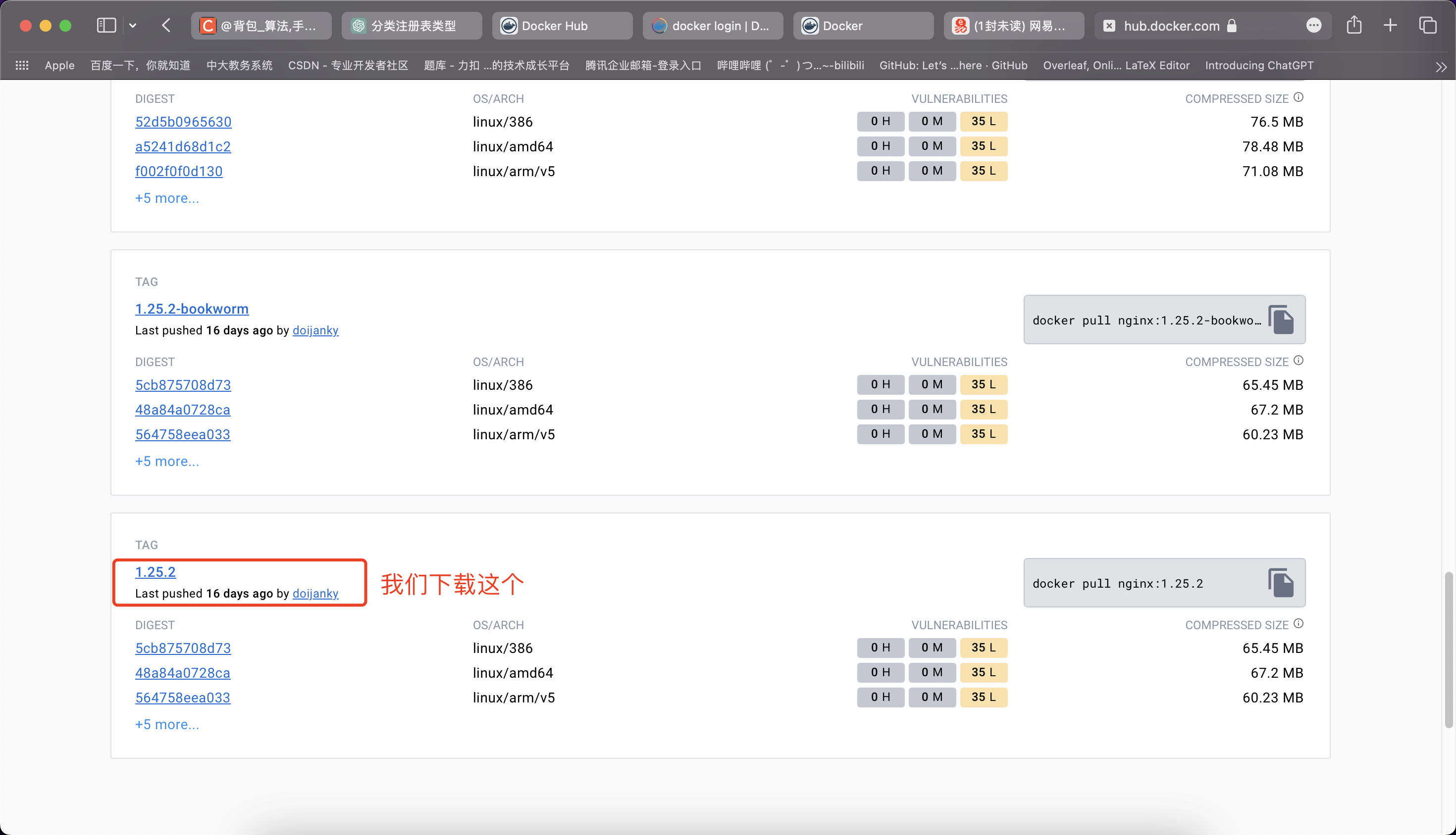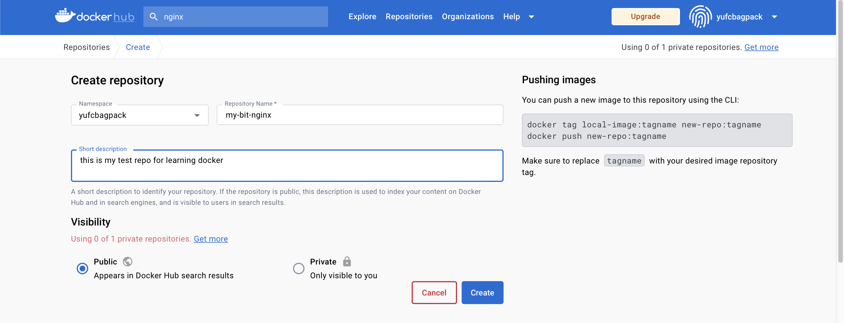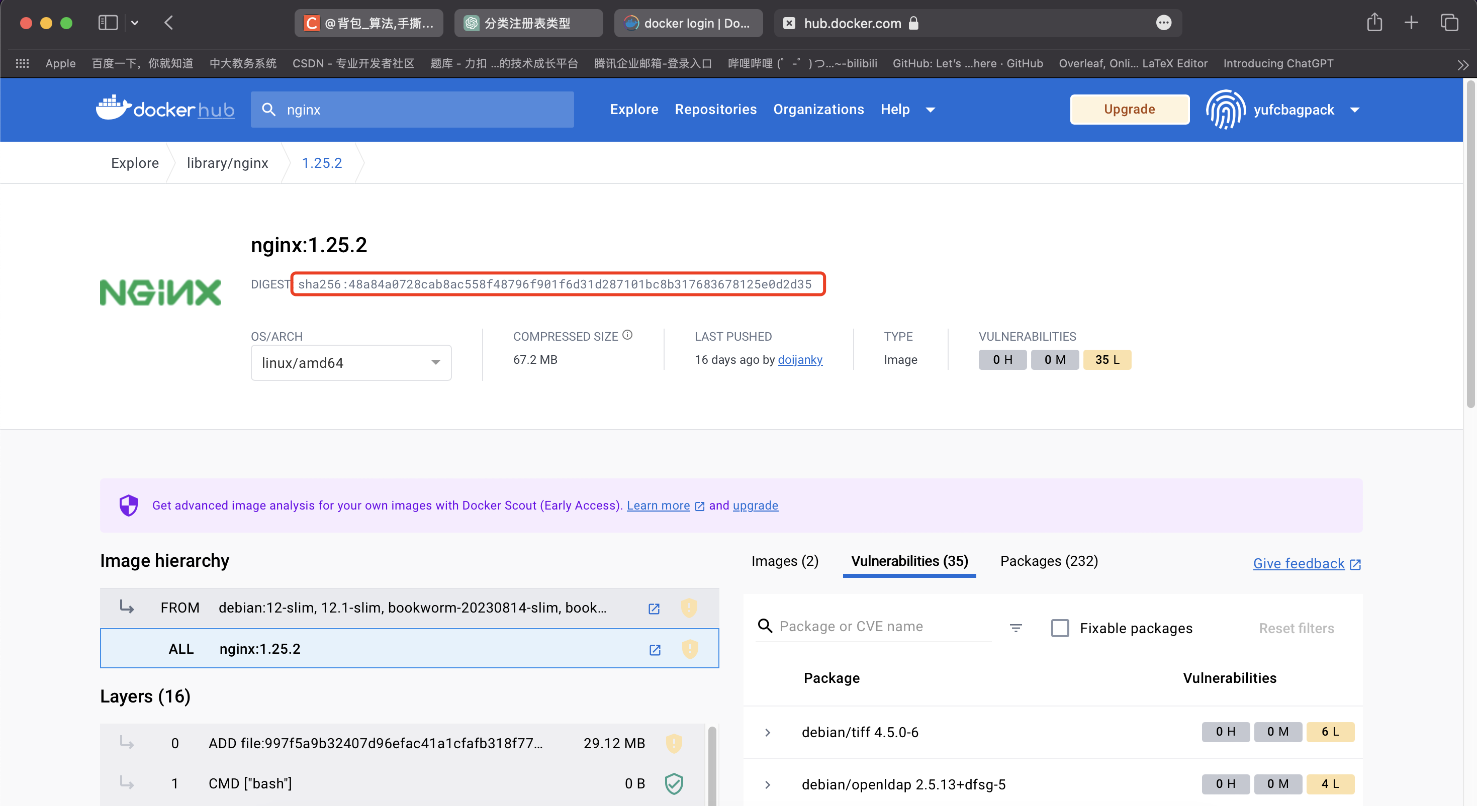xxxxxxxxxxdocker tag nginx:1.25.2 yufcbagpack/my-bit-nginx:1.25.2xxxxxxxxxx[root@ALiCentos7:~]$ docker push yufcbagpack/my-bit-nginx:1.25.2The push refers to repository [docker.io/yufcbagpack/my-bit-nginx]563c64030925: Mounted from library/nginx 6fb960878295: Mounted from library/nginx e161c3f476b5: Mounted from library/nginx 8a7e12012e6f: Mounted from library/nginx d0a62f56ef41: Mounted from library/nginx 4713cb24eeff: Mounted from library/nginx 511780f88f80: Mounted from library/nginx 1.25.2: digest: sha256:48a8xxxxxcab8ac558f48796f901f6dxxxxxx317683678125e0d2d35 size: 1778[root@ALiCentos7:~]$这样就推送完成了。
