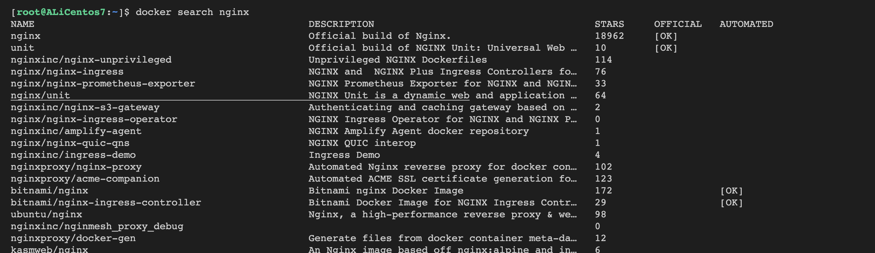 xxxxxxxxxxdocker search [OPTIONS] TERMxxxxxxxxxx--no-trunc : 显示完整的镜像描述-f <过滤条件> : 列出收藏数不小于指定值的镜像