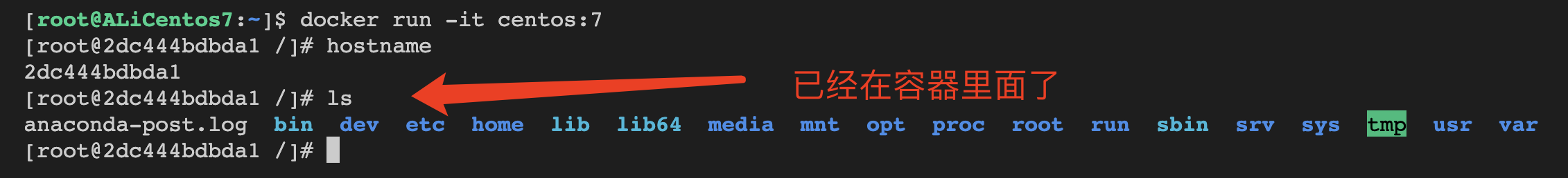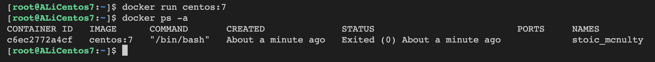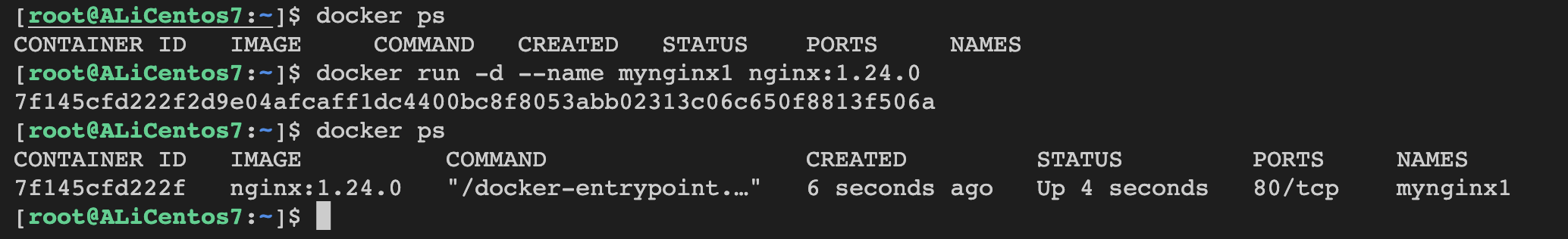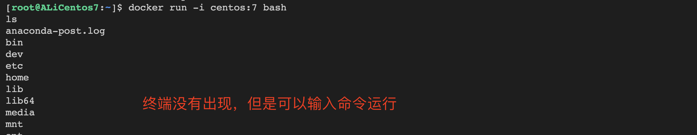 xxxxxxxxxx[root@ALiCentos7:~]$ docker run centos:7[root@ALiCentos7:~]$因为你没有给命令过去和这个容器交互。