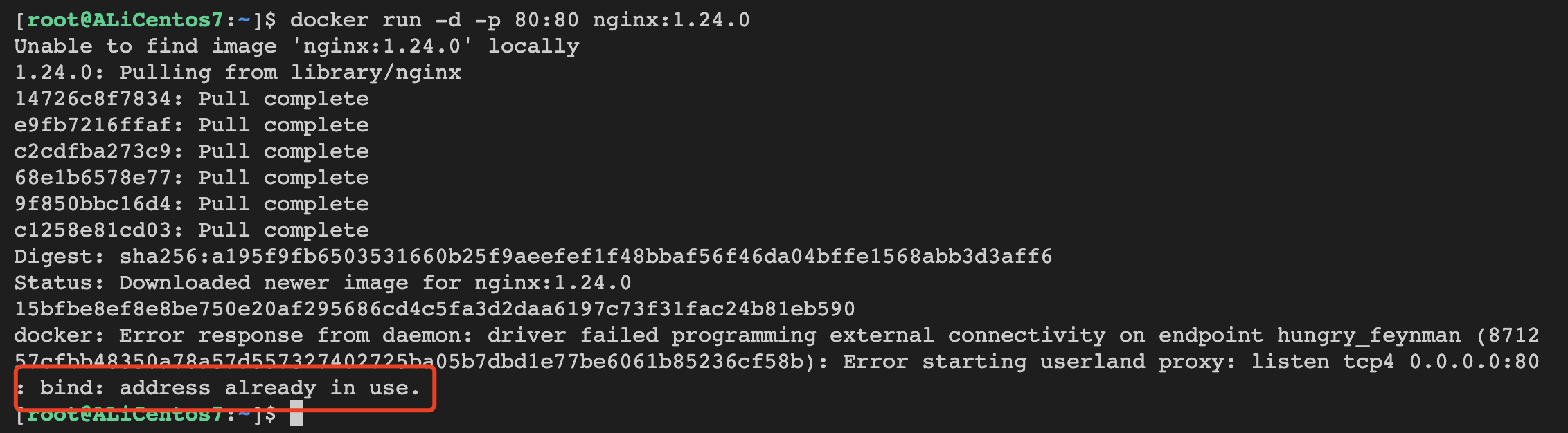 xxxxxxxxxx[root@ALiCentos7:~]$ docker run -d -p 8081:80 nginx:1.24.01c737416845472f193c3f402f7de62808e88a8781d0508a001f87ee99de5298e[root@ALiCentos7:~]$-P就会随机分配一个端口给我们。