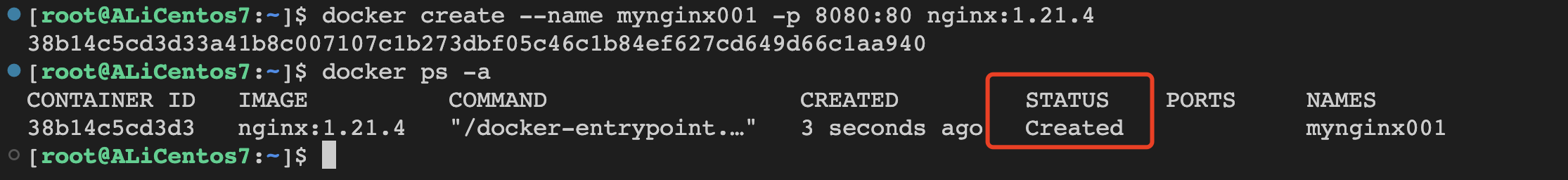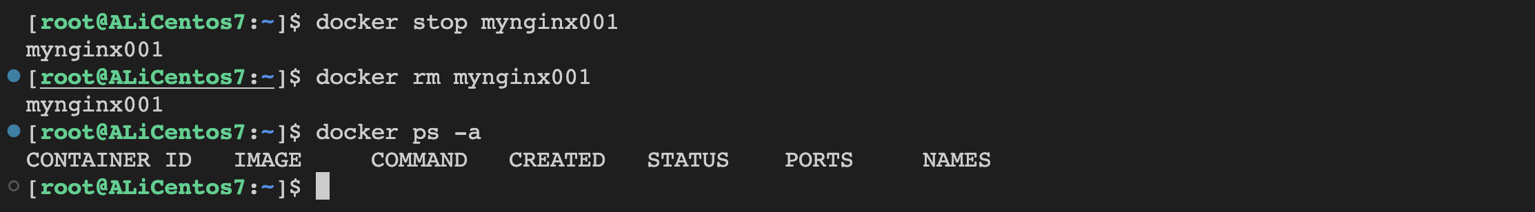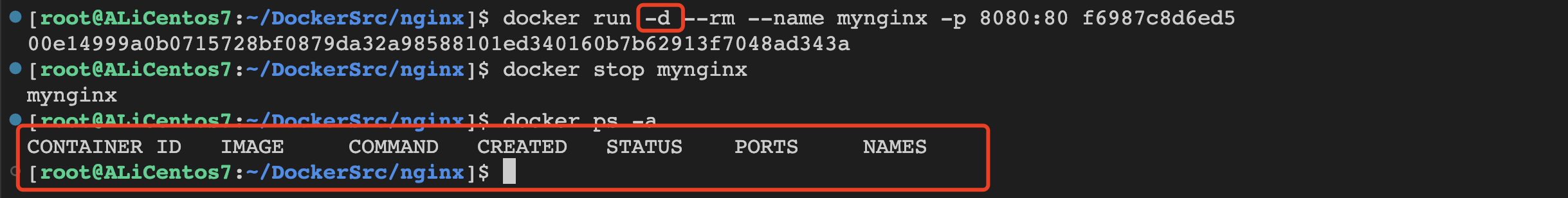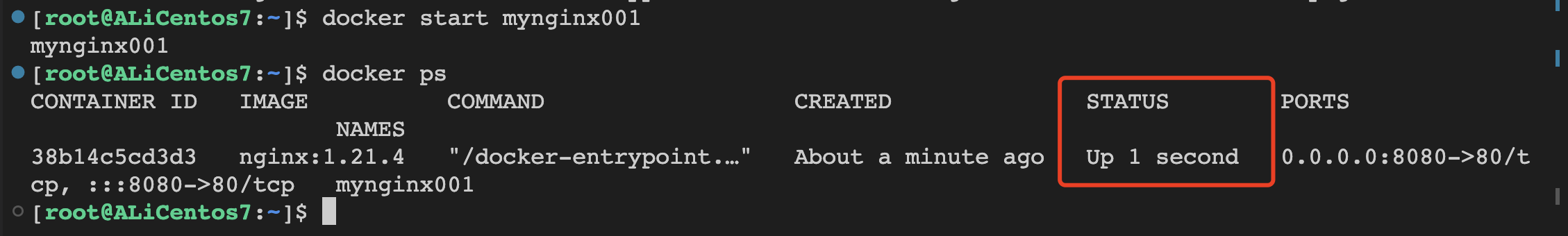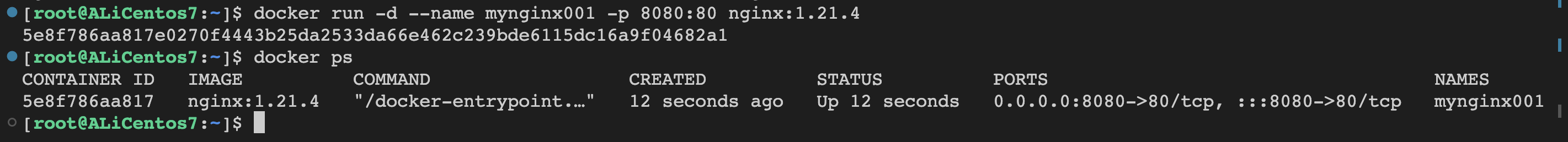 [root@ALiCentos7:~]$ docker ps -f name=mynginx003CONTAINER ID IMAGE COMMAND CREATED STATUS PORTS NAMESd4f00f4a7544 nginx:1.21.4 "/docker-entrypoint.…" 2 minutes ago Up 2 minutes 80/tcp mynginx003[root@ALiCentos7:~]$ 过滤正在运行的容器。