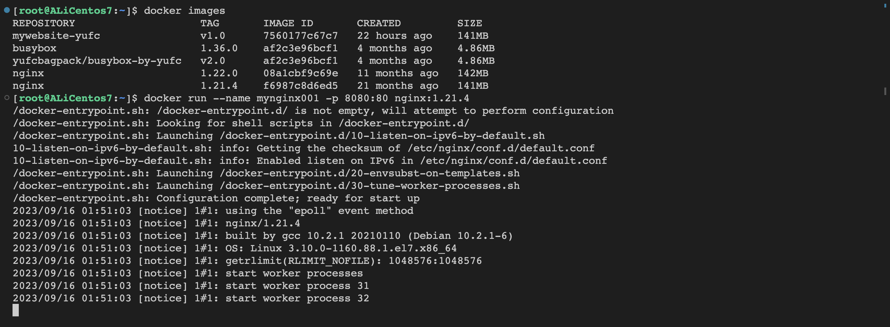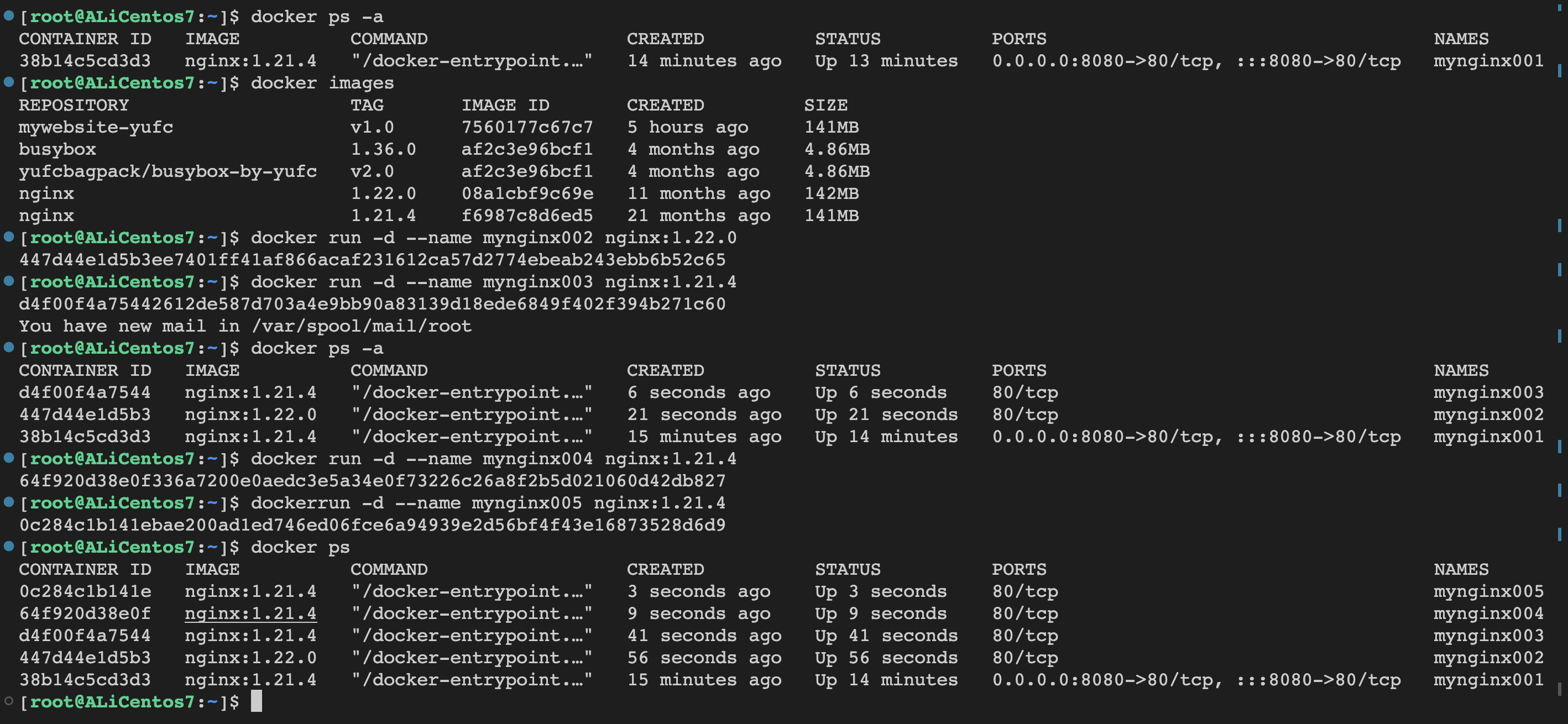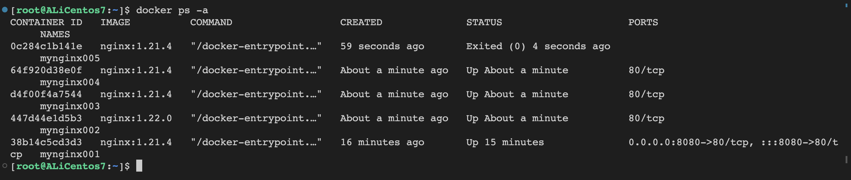 [root@ALiCentos7:~]$ docker ps -f status=runningCONTAINER ID IMAGE COMMAND CREATED STATUS PORTS NAMES64f920d38e0f nginx:1.21.4 "/docker-entrypoint.…" 2 minutes ago Up 2 minutes 80/tcp mynginx004d4f00f4a7544 nginx:1.21.4 "/docker-entrypoint.…" 2 minutes ago Up 2 minutes 80/tcp mynginx003447d44e1d5b3 nginx:1.22.0 "/docker-entrypoint.…" 3 minutes ago Up 3 minutes 80/tcp mynginx00238b14c5cd3d3 nginx:1.21.4 "/docker-entrypoint.…" 17 minutes ago Up 16 minutes 0.0.0.0:8080->80/tcp, :::8080->80/tcp mynginx001[root@ALiCentos7:~]$ 过滤镜像是nginx:1.21.4的容器。