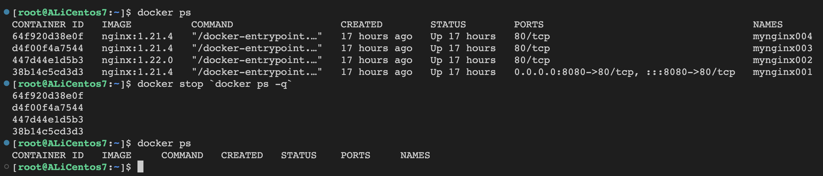 [root@ALiCentos7:~]$ docker ps -f ancestor=nginx:1.21.4 -q64f920d38e0fd4f00f4a754438b14c5cd3d3[root@ALiCentos7:~]$我们拿到这个id之后,就可以对容器进行批量的操作了。