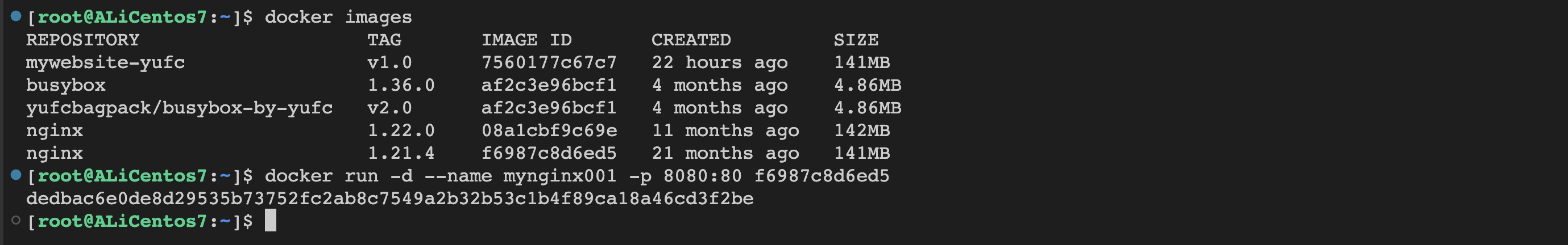 [root@ALiCentos7:~]$ docker ps -f ancestor=nginx:1.21.4 CONTAINER ID IMAGE COMMAND CREATED STATUS PORTS NAMES64f920d38e0f nginx:1.21.4 "/docker-entrypoint.…" 3 minutes ago Up 3 minutes 80/tcp mynginx004d4f00f4a7544 nginx:1.21.4 "/docker-entrypoint.…" 4 minutes ago Up 4 minutes 80/tcp mynginx00338b14c5cd3d3 nginx:1.21.4 "/docker-entrypoint.…" 19 minutes ago Up 18 minutes 0.0.0.0:8080->80/tcp, :::8080->80/tcp mynginx001[root@ALiCentos7:~]$-q就是只返回id