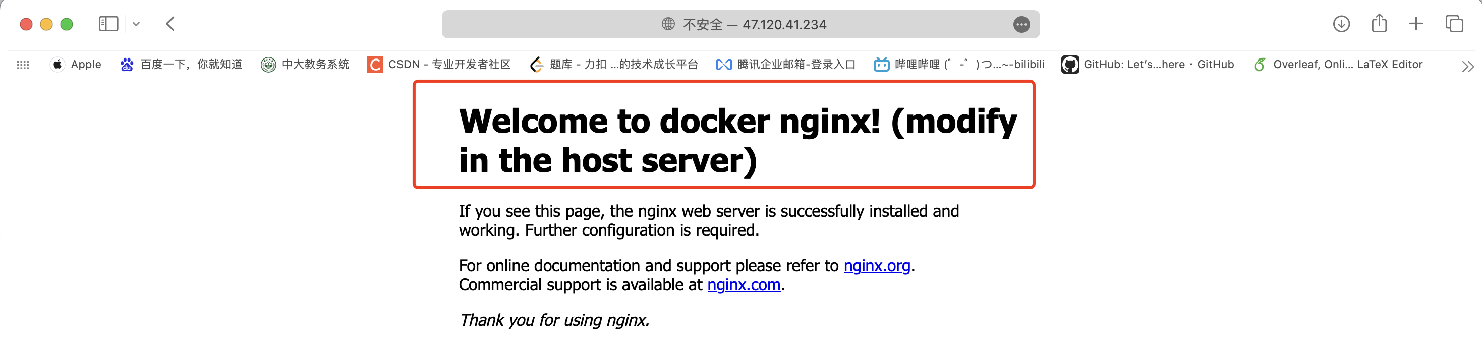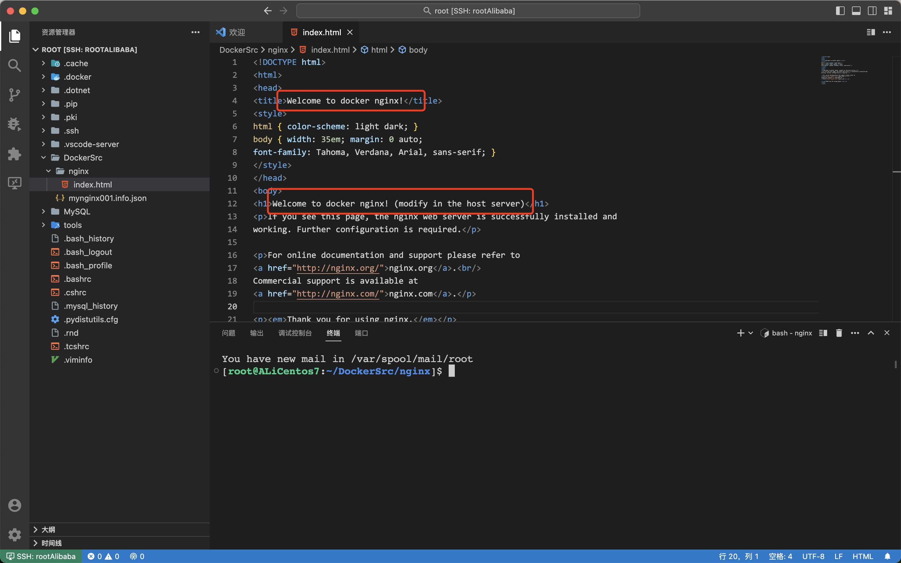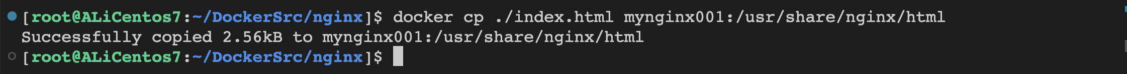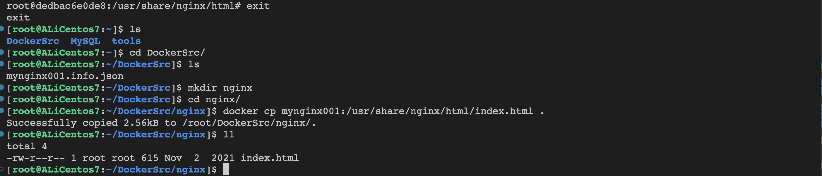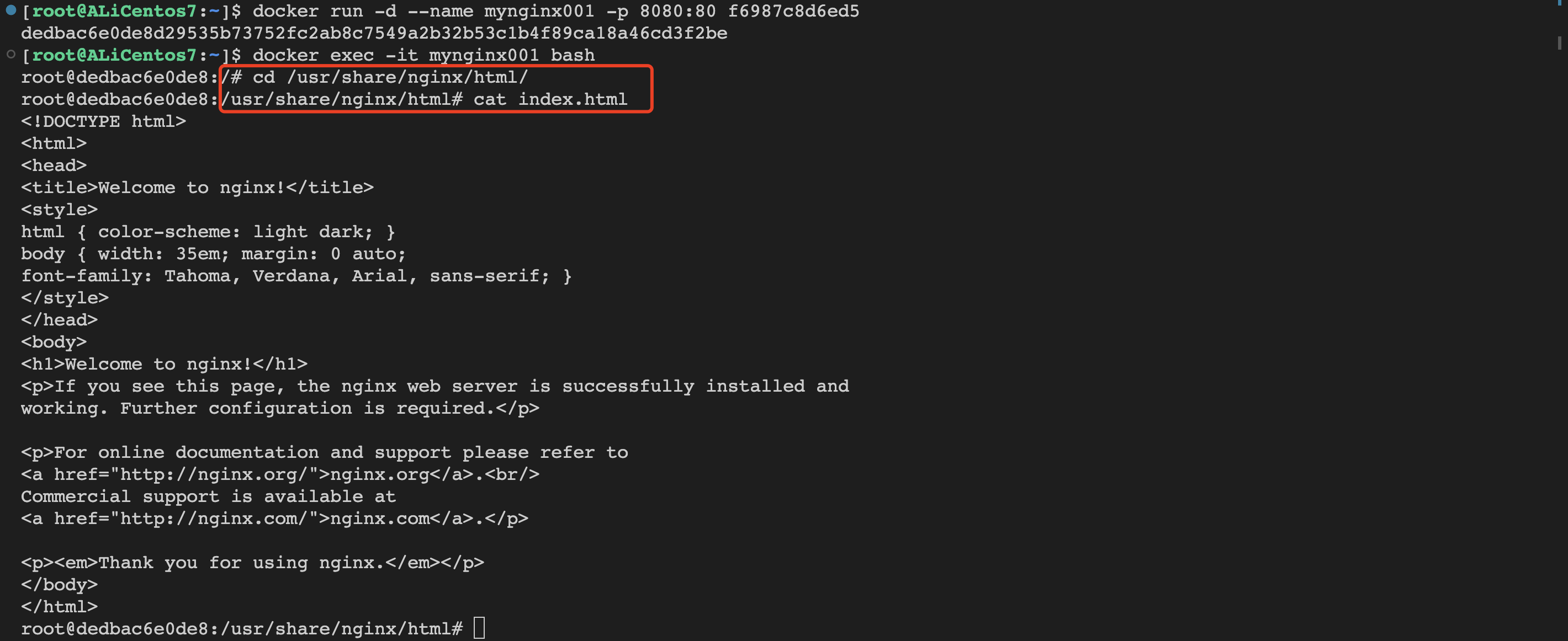 我们先从把容器内部的index.html拷贝到宿主机上,然后在宿主机上经过一定修改之后,再拷贝回容器里面去。