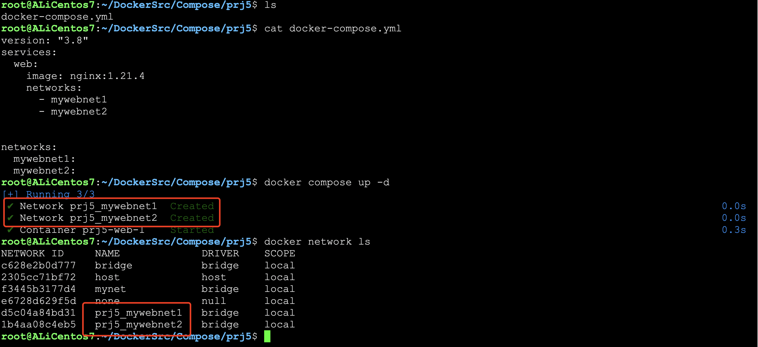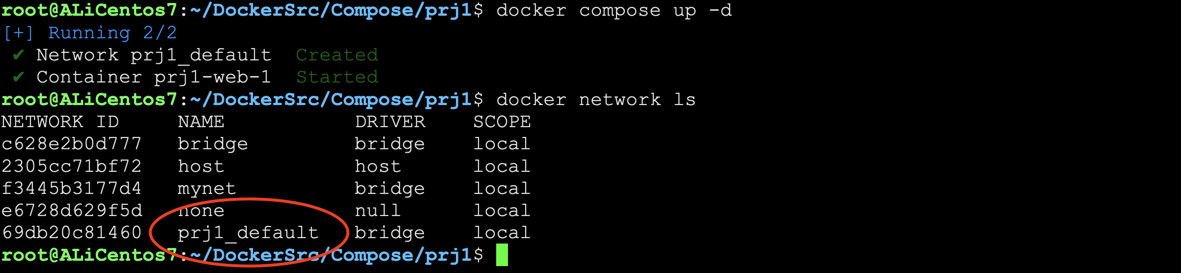 会默认创建一个桥网络的,然后把工程相关的容器加入到这个项目的网络里面去,和docker默认网络分开的。