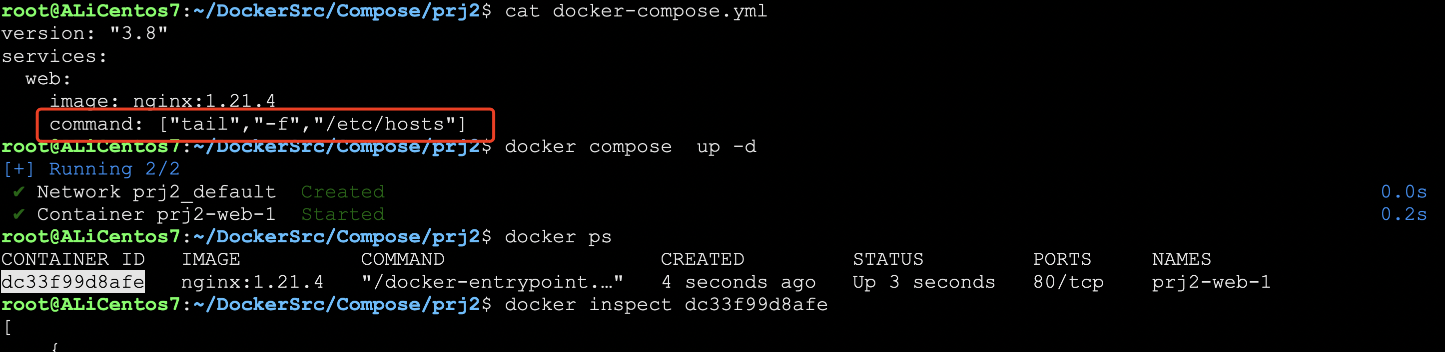 docker compose up | up 命令会构建,(重新)创建,启动, 链接一个服务相关的容器。 默认情况下如果容器已经存在, 将会停止并尝试重新创建他们。并使用之前挂载的卷。 --no-recreate 参数可以让容器不被停止或者重新创建, -d 表示后台运行 |