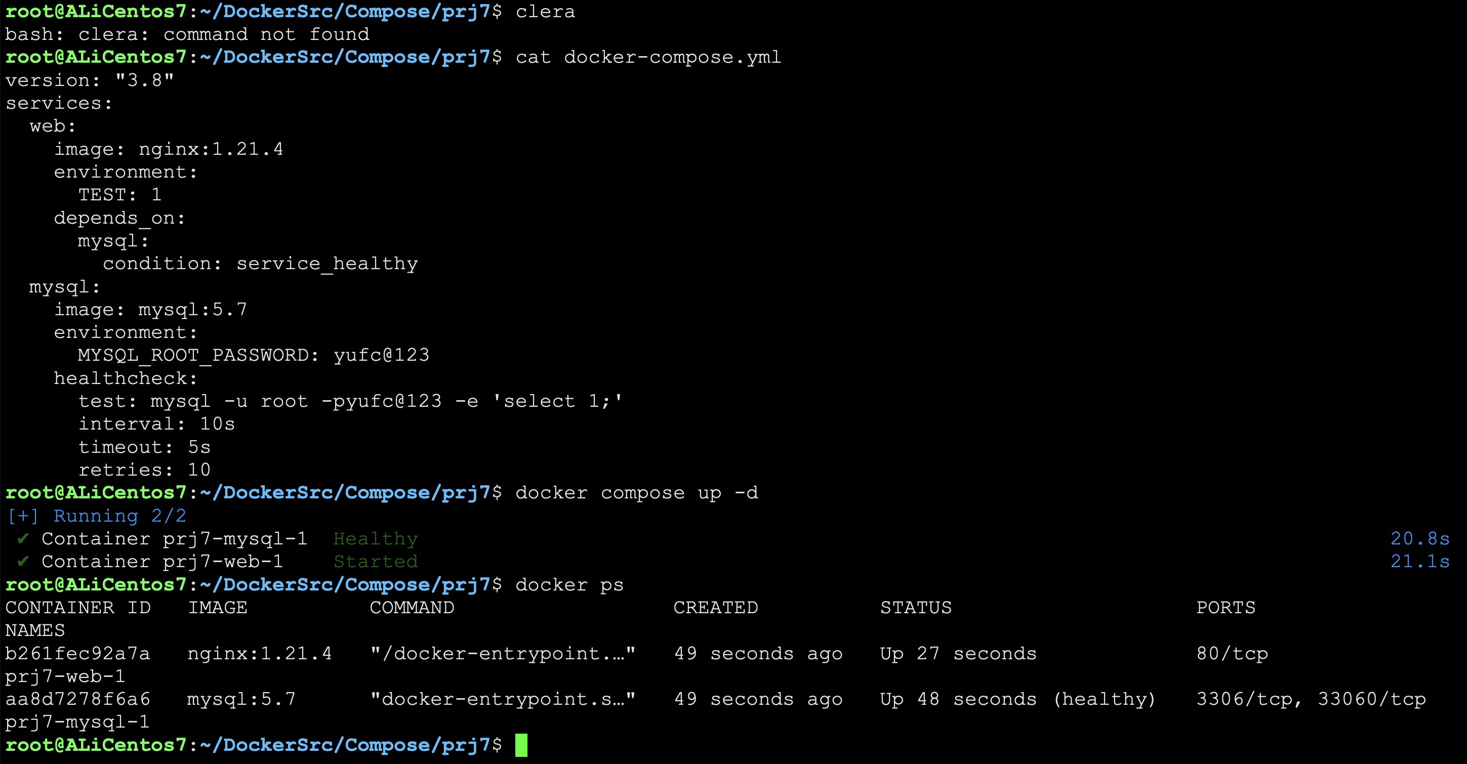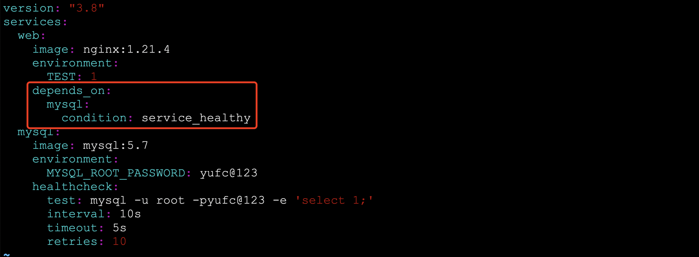 xxxxxxxxxxversion"3.8" services web imagenginx1.24.0 environment TEST1 depends_on mysql conditionservice_healthy mysql imagemysql5.7 environment MYSQL_ROOT_PASSWORD"bit@123" volumes/data/maxhou/mysqldata/varlib/:/var/lib/mysql healthcheck testmysql --user=root --password='bit@123' -e "SELECT 1;" interval10s timeout5s retries10