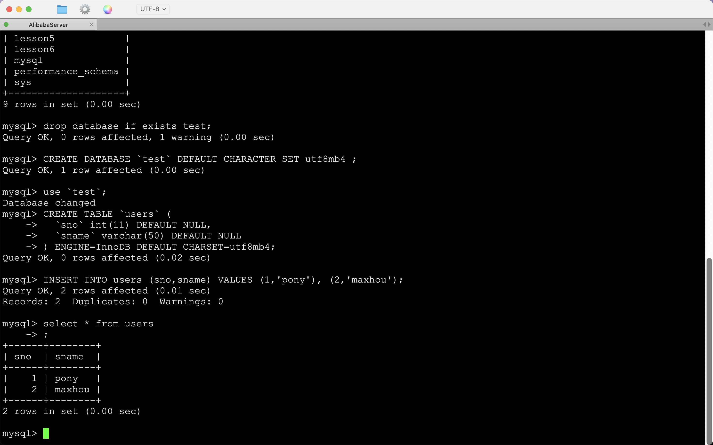 xxxxxxxxxxdrop database if exists test;CREATE DATABASE `test` DEFAULT CHARACTER SET utf8mb4 ;use `test`;CREATE TABLE `users` ( `sno` int(11) DEFAULT NULL, `sname` varchar(50) DEFAULT NULL) ENGINE=InnoDB DEFAULT CHARSET=utf8mb4;INSERT INTO users (sno,sname) VALUES (1,'pony'), (2,'maxhou');