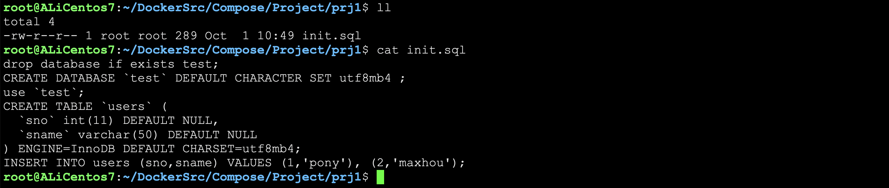 设计数据非常简单的一个表信息,写入两条数据,文件为init.sql