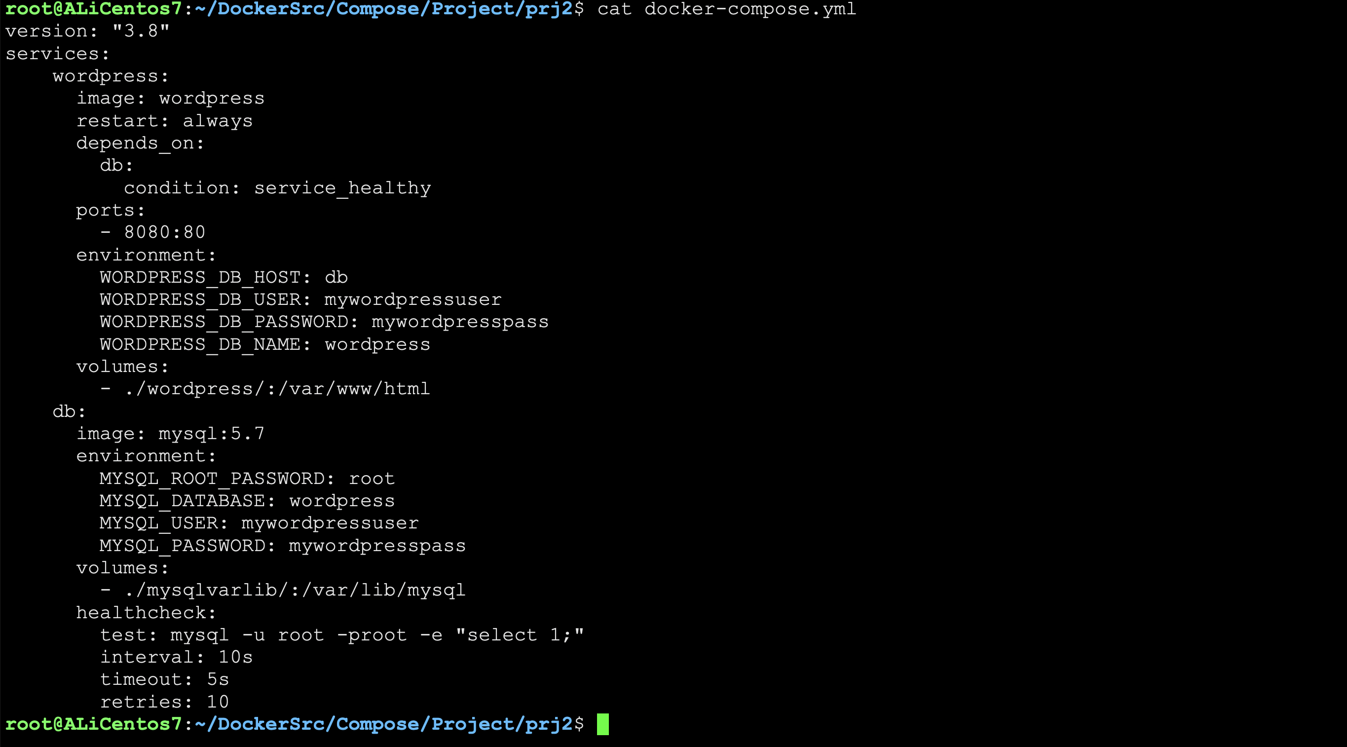 xxxxxxxxxxversion"3.8"services wordpress imagewordpress restartalways depends_on db conditionservice_healthy ports8080:80 environment WORDPRESS_DB_HOSTdb WORDPRESS_DB_USERmywordpressuser WORDPRESS_DB_PASSWORDmywordpresspass WORDPRESS_DB_NAMEwordpress volumes./wordpress/:/var/www/html db imagemysql5.7 environment MYSQL_ROOT_PASSWORDroot MYSQL_DATABASEwordpress MYSQL_USERmywordpressuser MYSQL_PASSWORDmywordpresspass volumes./mysqlvarlib/:/var/lib/mysql healthcheck testmysql -u root -proot -e "select 1;" interval10s timeout5s retries10通过这个命令检查这个文件的语法是否有问题。