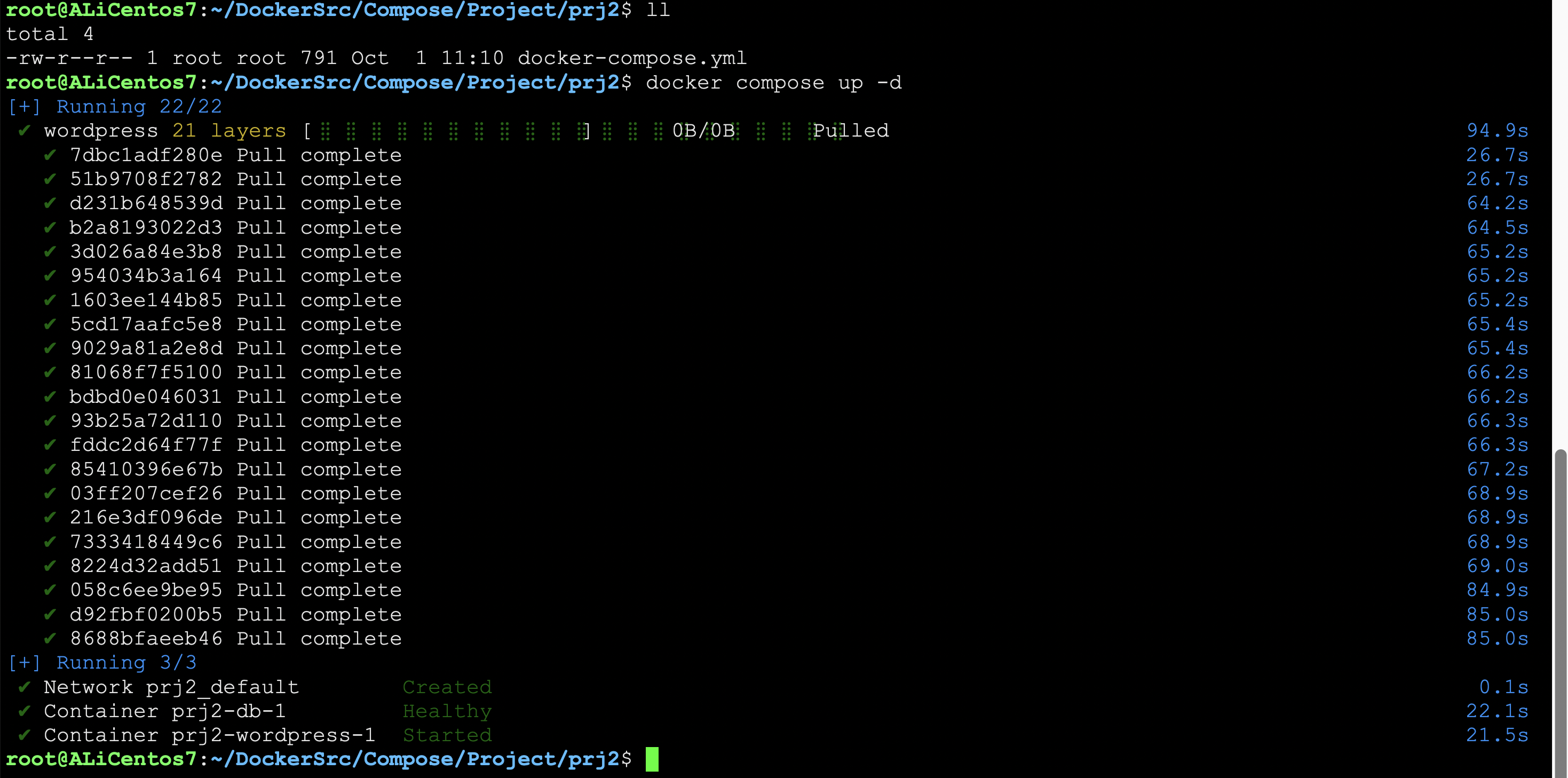 最后,执行 docker compose up 命令来启动并运行整个应用程序。